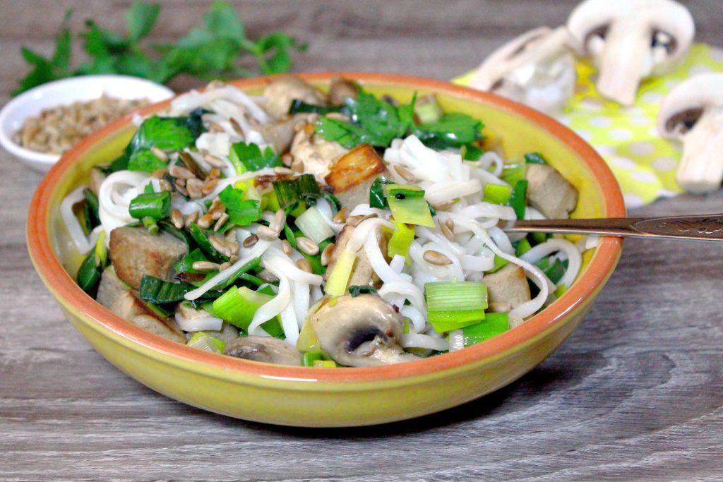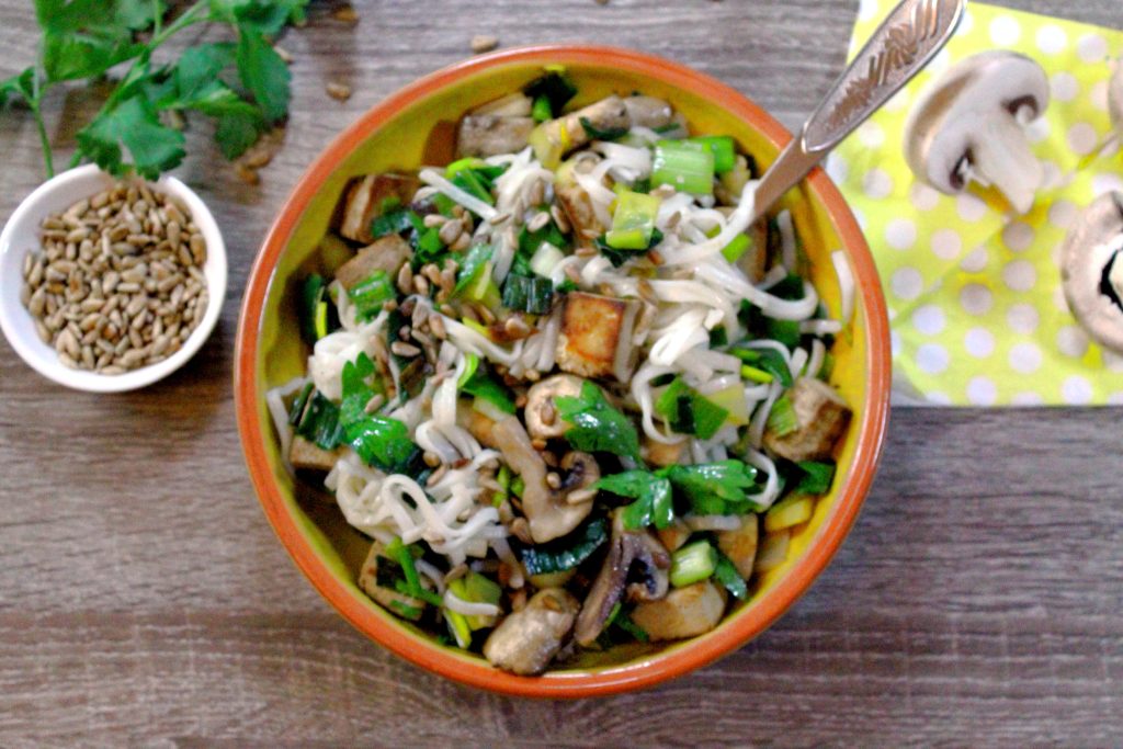 Es enthält kurz gebratene Champignons, die ihm einen leckeren Pilzgeschmack verleihen. Ich liebe Pilze und finde, dass die Champignons dieses Tofu-Nudeln-Pfanne geschmacklich aufwerten und es noch frischer und leckerer machen.
